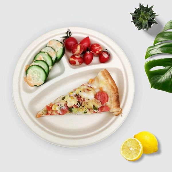 Disposable Bagasse 10 Inch Sugarcane Compostable Plates 3 Compartment Plates Images |